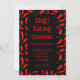 Invitation au concours de cool Chili Eating Contest. Piments de piment rouge vif, modelés sur un arrière - plan noir, avec une section modifiable pour entrer vos propres détails. Personnalisez cette invitation amusante à utiliser lors d'événements de manger du chili, d'événements de cuisine de nourriture épicée, ou pour les invitations d'anniversaire avec un thème chaud et épicé.