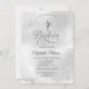 Croix argentée élégante, confettis sur un arrière - plan gris.
