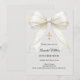 Invite guests with this sophisticated Confirmation invitation. The design features a luxurious ivory satin bow draped with delicate pearls and a shimmering gold cross set against a soft dove gray background. It is a beautiful choice for a young girl celebrating her Confirmation.