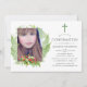 Invitation de confirmation de la forêt de bois sauvage avec fougères, fleurs sauvages et fraises et un arrière - plan de lessive vert sauge. Une photo en forme de portrait est conseillée.