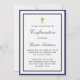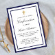 Une invitation moderne, élégante et de confirmation. Un arrière - plan blanc décoré de cadres bleus royaux et d'une croix dorée. Personnalisez et ajoutez un nom et des détails. Lettres de couleur noire.