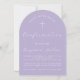 Une invitation de confirmation simple et moderne, en forme d'arc, sans distinction de genre. Il n'a que du texte blanc sur lavande (violet clair) arrière - plan. Dans la partie supérieure il y a une croix avec du texte voûté au-dessus. L'occasion et le nom sont écrits en script.