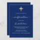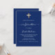 Une invitation moderne, élégante et raffinée. Un arrière - plan bleu marine décoré d'une croix dorée. Personnalisez et ajoutez un nom et des détails. Texte blanc.