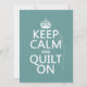 On peut lire "Keep Calm" et "Quilt On", dans le style de l'affiche classique "keep calm". Il y a une aiguille qui perce les lettres, avec des fils pendants. C'est un magnifique design qui séduit tous ceux qui aiment la courtepointe.