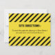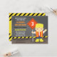 Une fête d'anniversaire à thème de la construction offre beaucoup de plaisir pour les garçons d'anniversaire qui aiment les jouets de construction et les machines parce qu'ils sont tellement d'idées de fête à travailler sur ce thème! Cette invitation à thème de construction a un garçon mignon en tenue de construction composé de casquette de sécurité, gilet orange et bottes jaunes. Il tient un panneau orange que vous pouvez personnaliser avec l'âge de l'enfant. Un motif à rayures jaunes et noires qui est utilisé pour les zones de construction et les barrières. Les enfants seront ravis et enthousiastes de recevoir cette invitation !