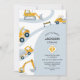 Construction moderne haut Le trafic 1er anniversaire Invitation Construction moderne et grise, jaune sur le thème de la première anniversaire invitation comprenant cinq véhicules de construction, route grise et un panneau jaune. Cette invitation d'anniversaire de construction peut être utilisée pour n'importe quel âge car l'âge est modifiable.