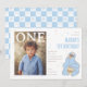 Celebrate a sweet first milestone with this Cookie Monster–inspired birthday design featuring a soft blue checkerboard background and playful confetti scattered throughout. The light blue and white pattern creates a cheerful, modern party backdrop, while subtle character line art woven into the checks adds a fun and cohesive Sesame Street touch.