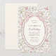 Charming coquette-style first birthday invitation featuring a delicate floral meadow pattern and an elegant pink bow detail. The scalloped oval frame and vintage-inspired flowers create a soft, storybook look perfect for a baby girl’s first birthday celebration. Inspired by cottagecore and classic heirloom designs, this floral birthday invitation is ideal for garden parties, spring birthdays, and sweet, feminine themes. A lovely choice for parents looking for a bow birthday invitation with a gentle meadow floral aesthetic.