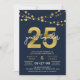 Invitation élégante pour une fête d'anniversaire de 25 ans avec des guirlandes lumineuses et "25" en or faux avec "ans ensemble" en blanc sur fond bleu foncé. La carte comprend un verso avec un motif assorti. Découvrez les articles assortis comme les autocollants et les tampons ici https://www.zazzle.com/collections/strings_of_lights_faux_gold_celebration_collection-119311942951401241?rf=238364477188679314