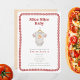 baby shower à thème "tranche bébé" avec illustration d'un costume de bébé avec manches rayées rouges et illustration de pizza au centre. La bordure est dessinée à la main en damier rouge avec des coins arrondis.