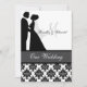 Impression damassée noire et blanche avec une bande grise, une mariée et mariée en silhouette, et des zones que vous pouvez personnaliser avec vos noms, monogramme initial, cérémonie mariage et information de réception sur une faire-part de mariage customisée qui est classe et traditionnel tout en un!