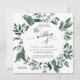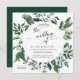 Invitation au format carré. Simple. Moderne. Élégant. Idéal pour un mariage en toute saison, cette œuvre d'art aquarelle de feuillage rassemblé en forêt a été créée par l'artiste Audrey Jeanne Roberts. Caractéristiques : feuilles d'eucalyptus, eucalyptus ensemencé, fougères et feuilles en émeraude riche, vert forêt. Droit d'auteur.