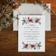 Ce faire-part de mariage de vacances simple et élégant présente des bouquets d'aquarelle élégants, faits de verdure moderne et de fleurs de Noël rouges et blanches sur un arrière - plan blanc. Au fond de l'invitation se trouve une couronne de Noël élégante et assortie.