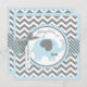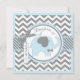 Ecran chic en chevron gris et blanc aux accents bleu bébé et à l'aspect 3D poka arc et ruban rayé et éléphant bleu avec arc cravate baptême invitation pour un bébé garçon.