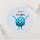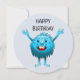 La charmante petite créature bleue aux grandes dents, brumeuse et brumeuse, dit joyeux anniversaire.