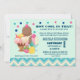 Invitation baby shower à thème crème glacée pour bébé. Sur un arrière - plan vert menthe avec une bordure en chevron bleu et crème. Des confettis colorés au sommet. Illustré avec le dessin d'une crème glacée à 3 boules sundae avec des arrosages colorés. Un cône de glace avec des boules de chocolat et de glace à la vanille. Un bol de glace néopolite avec une cerise sur le dessus. Des fraises et un ananas sont assis à côté des bols. L'été et doux.