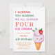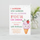 Célébrez le quatrième anniversaire de votre enfant avec une invitation à cônes de crème glacée mignonne et tendance! L'invitation présente une adorable caricature d'un cône de glace avec une fraise sur le dessus, ainsi que l'expression accrocheuse "Je crie, vous criez, nous crions tous pour de la crème glacée !" L'intérieur de l'invitation offre un espace suffisant pour des détails importants tels que la date, l'heure, l'emplacement et les informations RSVP.