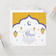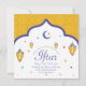 Invitation à l'Iftar ou aux célébrations de l'Aïd pour le Ramadan dans les tons or, bleu et blanc. Ce design lumineux et coloré a les contours d'une mosquée, d'un motif d'or arabe, d'une lune de croissant, d'étoiles et de lanternes faneuses.