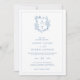 Faire-part de mariage bleu monogramme de crête formelle et élégante avec code QR et informations plus détaillées sur le dos.