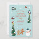 Frontière festive avec des pingouins, des cardinaux, des hommes en pain d'épice et des bonhomme de neige jouant parmi les flocons de neige et les étoiles. Tout le texte est modifiable pour votre partie