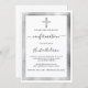 Une invitation moderne, élégante et raffinée. Un arrière - plan blanc décoré d'une fausse croix argentée et de faux cadres argentés. Personnalisez et ajoutez un nom et des détails. Texte noir.