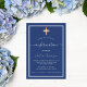 Une invitation moderne, élégante et raffinée. Un arrière - plan bleu marine décoré de cadres blancs et d'une croix dorée. Personnalisez et ajoutez un nom et des détails. Texte blanc.