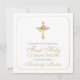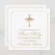 Parfait pour la première invitation à la communion de votre fille, ce design est simple et pur avec une fausse croix d'or accentuée par des roses roses et un cadre d'or fin sur un arrière - plan blanc. Au premier plan, le nom de votre fille dans une typographie de script moderne en faux or. Au dos de la carte se trouve une petite croix assortie et les détails de votre célébration que vous pouvez personnaliser. Conçu pour vous par l'artiste ©Susan Coffey.