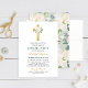 Elégante première communion sainte conception d'invitation pour une jeune fille dispose d'une croix décorative dorée avec un bel arrangement floral de jardin blanc neutre, rose rousse, et couleur crème fleurs roses avec vert et or vert vert. Le texte vert, or et noir souple peut être entièrement personnalisé pour votre événement. Un arrière - plan vert clair et un motif d'aquarelle fleurie coordonnant habille le dos de la carte.
