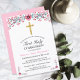 Célébrez la première sainte communion de votre fille avec vos amis et votre famille en les invitant avec cette Plutôt rose Floral Première sainte communion Invitation. Ce design présente une belle croix dorée contre un simple arrière - plan blanc aux fleurs d'aquarelle rose et bleue aux feuilles rouges et roses. Customisez le texte et la police à votre convenance. D'autres polices et styles sont disponibles.