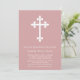 Invitation baptême personnalisable avec une croix blanche sur un arrière - plan rose poussiéreux.