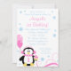 Une invitation à la fête d'anniversaire de l'hiver mignonne et girly onederland. Doté d'un pingouin, de cupcake, de tourbillons et de flocons de neige. Dans les tons rose et bleu. Personnalisez facilement votre fête !