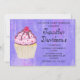 Un invitation de fête d'anniversaire avec l'illustration d'un cupcake à l'allure délicieuse. Le gel rose et les gouttelettes de chocolat. Porte-cupcake jaune et framboise sur le dessus. Yummy ! L'arrière - plan est une texture abstraite violette avec des petits coeurs partout.