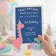 Celebrate your child's fifth birthday with this cheerful dinosaur-themed invitation! It features a cute cartoon design of a pink dinosaur and a green dinosaur with a dark blue background and vibrant colors. The design is fully customizable to suit your child's name, age, and party details. Perfect for children's parties looking for a fun and unique touch.