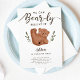 Carte d'invitation pour la fête d'anniversaire du mignon ours avec illustration d'un petit roulé sur le dos. Ce design boisé a un texte sur le dessus qui dit "Nous pouvons croire à l'ours".