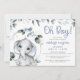 Invitation baby shower moderne avec un éléphant d'aquarelle mignon tenant un lapin farci entouré d'eucalyptus d'aquarelle douce et verdure en bleu et gris poussiéreux avec le titre OH BOY! en typographie script de calligraphie. ASSISTANCE : Pour obtenir de l'aide sur la modification/la personnalisation de la conception, le changement de couleur, le transfert de la conception vers un autre produit ou si vous souhaitez coordonner des éléments, contactez le concepteur AVANT DE COMMANDER via l'onglet MESSAGE Conversation Zazzle ou par courriel à l'adresse makeitaboutyoustore@gmail.com.