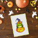 Une invitation à la fête d'Halloween avec une mignonne grenouille caricaturale verte aux yeux d'insectes portant un casquette de sorcière violette et assise sur un citrouille d'Halloween !