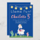 Faites une fête avec toute cette invitation amusante à la fête d'anniversaire de lama. Ce design comporte une chaîne de lumières en forme d'étoile avec un arrière - plan bleu foncé avec cactus et un lama décoré avec une couronne et des fleurs.