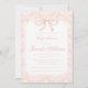 Fêtez l'arrivée de votre petite fille avec notre élégante invitation à la douche pour bébé mignonne. Avec son arc rose pastel au motif damassé à l'arrière, cette invitation donne le ton parfait pour une fête de printemps ou d'été.