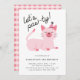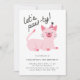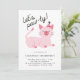 Jolie invitation à la fête d'anniversaire pour la fête du chat de votre enfant. Illustration d'une chatte rose avec un sourire sur le visage portant un casquette de fête. Le texte ci-dessus dit : "Passez-y !" Les informations de la partie suivante. Les textes sont facilement personnalisables en ligne. Le dos de la carte est en plaid rose qui correspond à la couleur du chat.