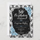 Elégante invitation à 50e anniversaire fleurie avec votre photo au verso de la carte. Noir noir blanc bleu poussiéreux design avec fausse parties scintillant argent. Caractéristiques noir et blanc damas motif, bleu clair rose, police de script et confetti. Parfait pour une fête anniversaire adulte élégante. Personnalisez avec vos propres détails. Peut être customisé pour n'importe quel âge ! Invitations Zazzle imprimées ou téléchargement instantané modèle imprimable numérique.