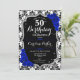 Elégante invitation à 50e anniversaire fleurie avec votre photo au verso de la carte. Bleu noir blanc bleu royal design avec fausse parties scintillant argent. Caractéristiques noir et blanc damas motif, saphir bleu roses, police de script et confetti. Parfait pour une fête anniversaire adulte élégante. Personnalisez avec vos propres détails. Peut être customisé pour n'importe quel âge ! Invitations Zazzle imprimées ou téléchargement instantané modèle imprimable numérique.