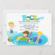 Commencez votre fête avec cette adorable invitation. Parfait pour la fête de piscine de ce garçon d'anniversaire. Il a un arrière - plan blanc. Une grande piscine avec un adorable et mignon garçon se tient à côté dans une flaque d'eau. Il a les cheveux blonds et les lunettes bleues sur la tête. Dans la piscine se trouve un mignon garçon blond aux cheveux flottant dans un radeau. A côté de lui, une adorable fille aux cheveux bruns flottant dans un tube vert. De l'autre côté du invitation se trouve le mot pool party. Les deux O dans la piscine sont des tubes colorés. Découvrez les nombreux autres produits et designs de cette ligne de fête de piscine. ©Illustrations JW