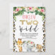 Ce design sucré et coloré présente trois animaux safari et un faux mot d'or, quelques fleurs feuillues et tropicales et un motif en peau de léopard. Idéal pour le safari d'une fille à deux fêtes de deuxième anniversaire à thème sauvage.