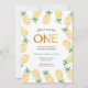 Faites une fête tropicale de premier anniversaire pour votre petit ! Cette adorable invitation à l'anniversaire présente des ananas aquarelle et un "one" en faux or, moderne et tendance. L'arrière - plan dispose d'un motif triangle jaune. Tous les détails, y compris (sauf l'âge), sont personnalisables. © Mini Moi Prints