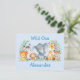 Carton d'invitation de fête d'anniversaire de premier anniversaire de Safari Jungle aquarelle. Les bébés animaux comprennent l'éléphant, le singe, la girafe, le rhinocéros, le zèbre et le lion sur des feuilles de fougère. Feuillage botanique aquarelle. Texte bleu.