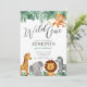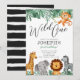 Tout le texte est modifiable sur l'invitation. Parfait pour un thème wild one. Comprend des feuilles vertes, feuillage, éléphant, girafe, singe, zèbre et lion.