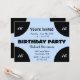 Centre bleu clair sur l'invitation de fête d'anniversaire noir. Le bleu et le noir donnent un aspect moderne à l'ensemble. Ajouter l'âge ou laisser vide - Compléter avec RSVP