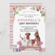 Des chiots mignons avec des chapeaux d'anniversaire et des cadeaux. Le célébrant est assis sur un canapé rose. Dans les coins supérieurs se trouvent des arrangements floraux colorés. Le fond est blanc