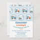 Une invitation super mignonne à l'anniversaire avec du matériel de construction, camion à benne, mélangeur de ciment à rayures bleu pastel et blanc.