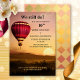 Une invitation d'anniversaire de mariage romantique avec une peinture d'une montgolfière sur un paysage de rêve au coucher du soleil. Le dos montre un motif à carreaux imprimé en or.